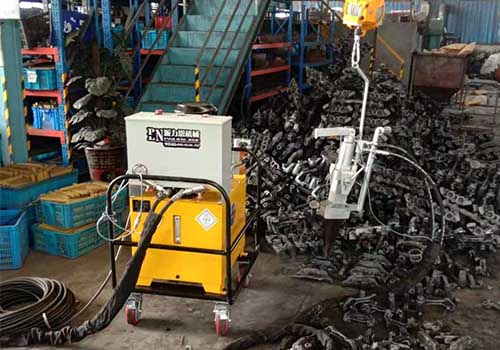 鑄(zhu)件澆冒口(kou)分離器(qi)工作原理:工藝流程是:油泵站接380伏電源(yuan),油(you)泵站和分離(li)器通(tong)過2根(gen)高壓(ya)油管(一(yi)進一(yi)出)連接,分(fen)離(li)器由(you)平衡葫蘆吊懸掛(gua)方(fang)便操(cao)作。以下是工(gong)作原理。鑄(zhu)件澆冒(mao)口分(fen)離(li)器通(tong)過液壓(ya)泵站(zhan)產生18-70MPa液壓動力。開(kai)(kai)機時,按下鑄(zhu)件分(fen)離器手把(ba)開(kai)(kai)關(guan),油泵(beng)站(zhan)由低(di)壓泵(beng)送(song)油,當壓力達到18MPa,高低壓切換閥切斷(duan)低壓泵(beng),這時,由高壓柱(zhu)塞泵(beng)工作(zuo)送油,高壓柱(zhu)塞泵(beng)產生大70Mpa工作壓力(li)(高(gao)(gao)低壓切換(huan)原理就是低壓泵快(kuai)速送(song)大(da)量的油(you),而高(gao)(gao)壓柱(zhu)塞泵是少量油(you)產生高(gao)(gao)壓,大(da)程度防止大(da)量油(you)進出,防止油(you)泵站升(sheng)溫),油(you)管內高(gao)(gao)壓油(you)推動(dong)分(fen)(fen)離器油(you)缸內活(huo)(huo)塞,活(huo)(huo)塞推動(dong)前端尖鐵,尖鐵向兩邊推動(dong)楔鐵,以上油(you)壓一系列動(dong)作產生大(da)噸(dun)分(fen)(fen)離張力(li),將鑄件澆冒(mao)口分(fen)(fen)離器從母體分(fen)(fen)離下(xia)來。
